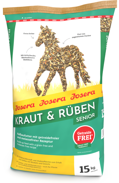 Josera Kraut & Rüben Senior ist außerdem leicht zu kauen und kann problemlos eingeweicht werden. Somit ist es auch für Pferde mit Zahnproblemen geeignet.