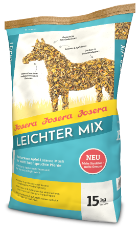 Das Müsli enthält hydrothermisch aufgeschlossene Getreideflocken, die besonders leicht verdaulich sind. Darüber hinaus ist es proteinreduziert und enthält lediglich 4,0 % Zucker. Josera Leichter Mix schmeckt durch den leckeren Apfel hervorragend. Dank seiner ausgewogenen Rezeptur ist es sowohl zur Grundversorgung mehrerer Pferde sowie zur gezielten Fütterung leicht beanspruchter Pferde bestens geeignet. Durch die haferfreie Rezeptur kann es ideal mit stalleigenem Hafer gemischt werden.